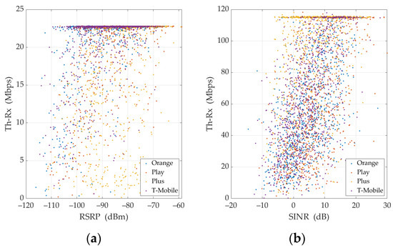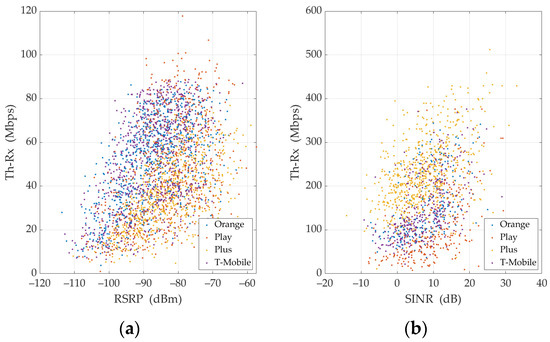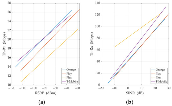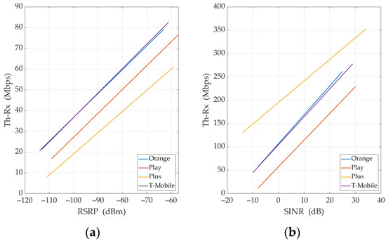 Considering the obtained results, we conclude that RSRP (or possibly RSRP-5G) should be used to estimate Th-Rx for UL TCP. It can be regarded as a similar approach to the one proposed by M. Lorenz [29] and the Office of Electronic Communications, i.e., the Polish regulatory authority [30]. However, for DL TCP, we propose using SINR (or alternatively SINR-5G) for Th-Rx estimation. Figure 6 and Figure 7 illustrate measured Th-Rx versus RSRP or SINR and appropriate regression lines for (a) UL and (b) DL, respectively.