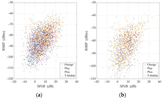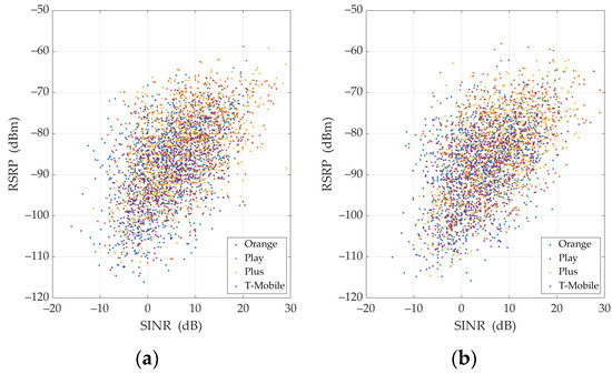 - RSRP (dBm)—reference signal received power (RSRP) is utilized mainly to rank among different candidate cells in accordance with their signal strength. Generally, the reference signals on the first antenna port are used to determine this parameter. However, the reference signals sent on the second port can also be used in addition to the radio stations on the first port if UE can detect that they are being transmitted [47]. Basically, RSRP is defined as the linear average over the power contributions (in watts) of the resource elements that carry cell-specific reference signals within the considered measurement frequency bandwidth [48,49].