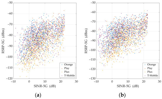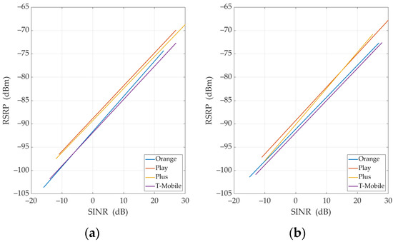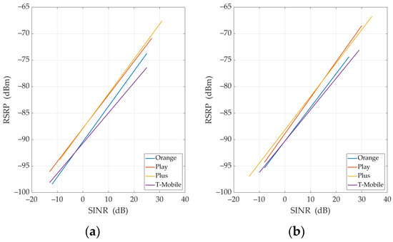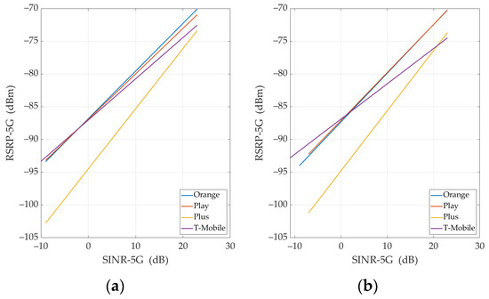 For four MNOs and TCP, Figure 8, Figure 9, Figure 10 and Figure 11 present RSRP versus SINR or RSRP-5G versus SINR-5G, respectively. In each figure, we show the measurement data (see Figure 8 and Figure 10) or appropriate regression lines (see Figure 9 and Figure 11) for (a) UL and (b) DL, respectively.