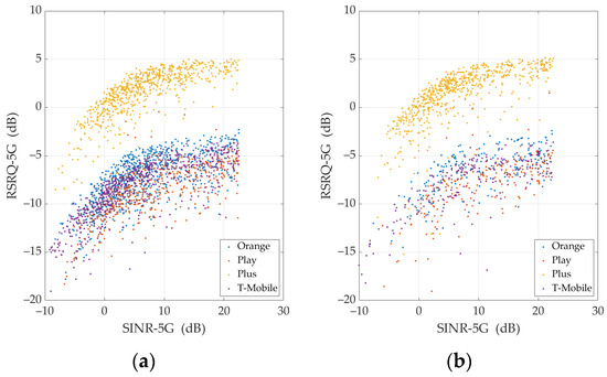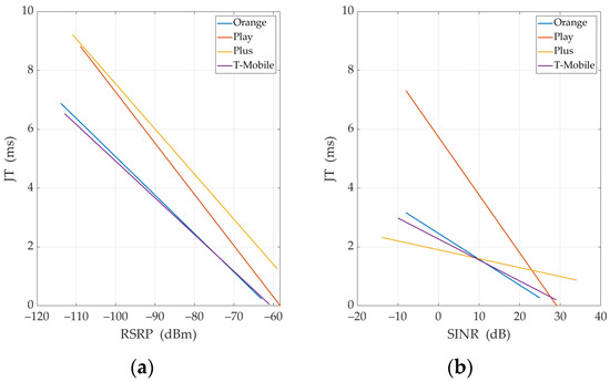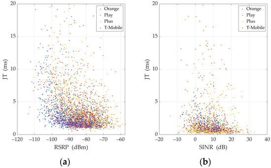 The evaluation of PCCs for UDP generally shows that the correlation degrees of parameters are lower than for TCP. Th-Rx is very weakly correlated with Th-Sx and RDR. Meanwhile, the correlation of Th-Rx with Th-Rate is very strong (i.e., linear), and with JT, it is moderate or strong. As mentioned in Section 2.3, for UDP, Th-Sx should be set to a large value that exceeds the throughput achievable. When analyzing measured Th-Sx values, they are usually constant values, much larger than Th-Rx. Therefore, considering Equation (2), we should expect a small absolute value of PCC for Th-Rx and Th-Sx and a very large one for Th-Rx and Th-Rate. On the other hand, the practically constant value of Th-Sx is the reason for a very weak correlation with other analyzed metrics. In the UDP analysis, JT is additionally included. As mentioned, this parameter is moderately (Plus), borderline moderately/strongly (Orange, Play), or strongly (T-Mobile) correlated with Th-Rx and Th-Rate. On the other hand, the correlation of JT with signal metrics is weak. In the case of Th-Rx and Th-Rate, correlation degrees with signal parameters are usually moderate for UL and DL. The nature of the correlation between the signal parameters is similar for UDP and TCP, i.e., from moderate to strongly correlated. This is due to the fact that the signal parameters depend primarily on the propagation conditions and the mutual location of the UE and base station and not on the provided services.