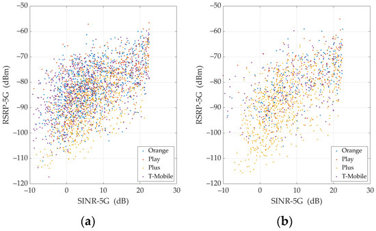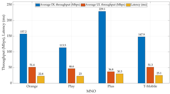 The measurement campaign was carried out for four MNOs: Orange, T-Mobile, Play, and Plus, called Orange Polska, T-Mobile Polska, P4, and Polkomtel, respectively. They are global MNOs providing 4G/5G services in Poland. In the following, we use the shorter brand-name MNOs.
