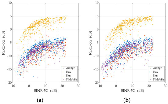 Throughput measurement data for TCP are limited to 22.83 and 118.24 Mbps for UL and DL (see Figure 6a,b), respectively. It is due to the specificity of this protocol. The assessment of the throughput of individual MNOs is complex based on measurement data due to their spreading. This evaluation is facilitated by the regression lines presented in Figure 7a,b. Basically, we can see that, in UL, the lines for Orange and T-Mobile overlap, and the line for Play is close to them. In the DL case, the Orange and Play lines overlap, while the T-Mobile line has a similar slope. The similarity of the lines for Orange and T-Mobile may result from the mentioned RAN sharing and the same base station locations. Therefore, we may generally assume that the throughput versus radio signal parameters for these three MNOs can be modeled with one average curve. The Plus regression lines for both UL and DL are clearly different from other MNOs. The throughput at a given RSRP/SINR value is worse or better than the other MNOs for UL and DL, respectively. A more significant DL throughput may result from the use of the 40 MHz band at the 2.6 GHz frequency, which is used only by Plus in Poland.