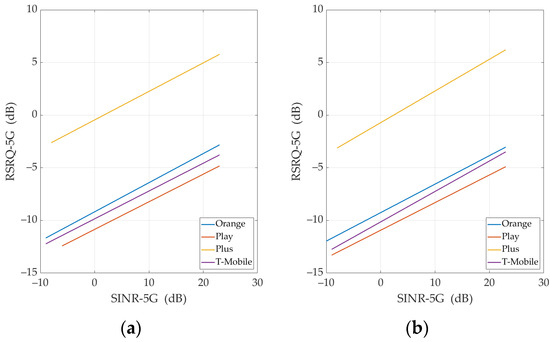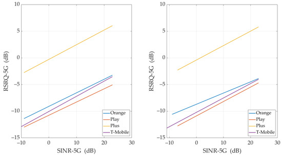 - RSRQ-5G (dB)—Reference Signal Received Quality (RSRQ) for 5G NR is named as a Second Synchronization-RSRQ (SS-RSRQ) [50,51]. It is defined as the ratio of N×SS-RSRP/NR carrier Received Signal Strength Indication (RSSI), where N is the number of resource blocks in the NR carrier RSSI measurement bandwidth. The measurements in the numerator and denominator shall be made over the same set of resource blocks. The SS-RSRQ measurements can be used for cell selection, cell reselection, and mobility procedures. The RSRQ-5G range is defined from –43 to 20 dB [52]. SS-RSRQ is used in 5G NR networks to determine the quality of the radio channel. RSRQ, unlike RSRP, also includes interference level due to the inclusion of RSSI in the calculation. This parameter is also used for cell selection and handover if the RSRP is insufficient. It happens mainly in border parts of a cell. It is similar to RSRQ determined in LTE [53].