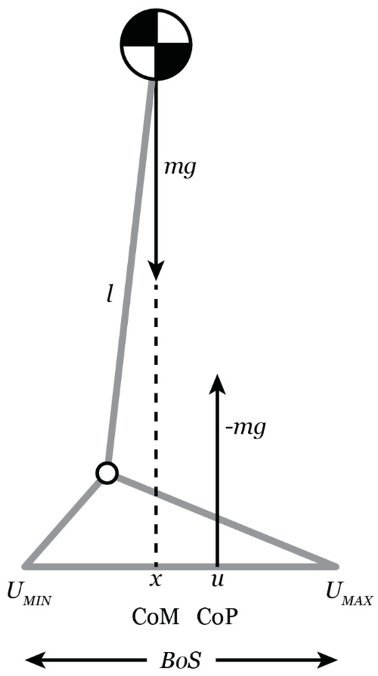 Schematic of the inverted pendulum model [48,49]. Represented by a single mass on top of a stick, the body’s center (COM) is located at a distance l from the ankle joint center. The center of pressure (COP, u) identifies the location of the ground reaction force, which is placed relative to the vertical projection of the center of mass, x. The boundaries of the base of support (BOS), UMIN and UMAX, demonstrate the potential range of the COP. Note this figure originated in [53].