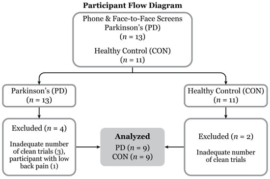 Participant flow diagram. Of the 13 Parkinson’s disease and 11 control participants recruited, 9 for each group were included for data analysis.