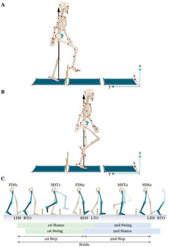 Schematic of the obstacle-crossing task for a left gait cycle with (A) the right (leading) limb for the first step; (B) the left (trailing) limb for the second step; (C) a depiction of the spatiotemporal gait parameters, including the events associated with the measures of dynamic stability. Red circles = markers attached to anatomical landmarks; blue circles = location of the center of mass; laboratory coordinate system located at the corner of a force plate with red x-axis, green y-axis, and blue z-axis; black arrow = ground reaction force under the stance limb; LHS = left heel strike; RTO = right toe-off; RHS = right heel strike; LTO = left toe-off; FDS1 = first double support of 1st stance limb (left trailing limb during 1st step with right limb); MST1 = midstance of 1st stance limb; FDS2 = first double support of 2nd stance limb (right leading limb during 2nd step with left limb); MST2 = midstance of 2nd stance limb; SDS2 = second double support of 2nd stance limb. Note that FDS2 is the same time point as second double support for the 1st stance limb. Note that the red circles on the skeletal images in (A,B) denote the model markers (a detailed description of this marker set can be found in [53]).