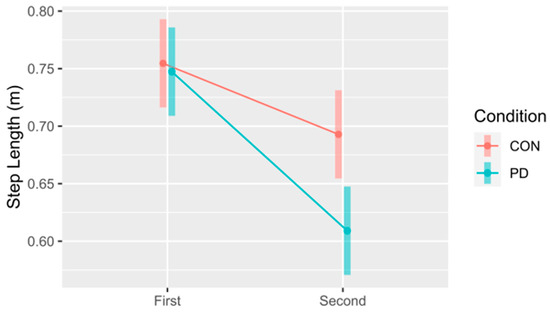 Comparison between the control (CON) and Parkinson’s (PD) groups for mean step length for the first and second steps. The 95% confidence intervals for each mean are included to illustrate significant differences, i.e., confidence intervals not overlapping, both within and between steps. Notably, this also suggests differences in the first and second steps within each group (CON and PD).