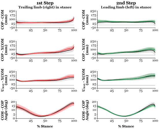 - Midstance one (MST1): At 50% of stance, the COP–XCOM and UMAX–XCOM demonstrate increasing positive values, which suggests a greater distance from the base of support (BOS), i.e., a less stable position.