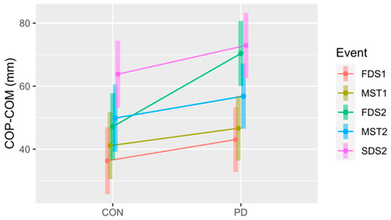 The COP–COM for the control (CON) and Parkinson’s (PD) groups at all five Events. FDS1 = first double support step 1; MST1 = midstance step 1; FDS2 = first double support step 2; MST2 = midstance step 2; SDS2 = second double support step 2. Note: FDS2 = second double support step 1. The 95% confidence intervals for each mean are included to illustrate significant differences, i.e., confidence intervals not overlapping, both within and between conditions. Notably, this also suggests differences between Events within each group (CON and PD).