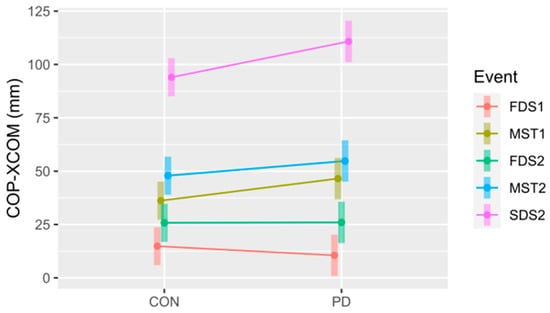 The COP–XCOM for the control (CON) and Parkinson’s (PD) groups at all five Events. FDS1 = first double support step 1; MST1 = midstance step 1; FDS2 = first double support step 2; MST2 = midstance step 2; SDS2 = second double support step 2. Note: FDS2 = second double support step 1. The 95% confidence intervals for each mean are included to illustrate significant differences, i.e., confidence intervals not overlapping, both within and between conditions. Notably, this also suggests differences between Events within each group (CON and PD).