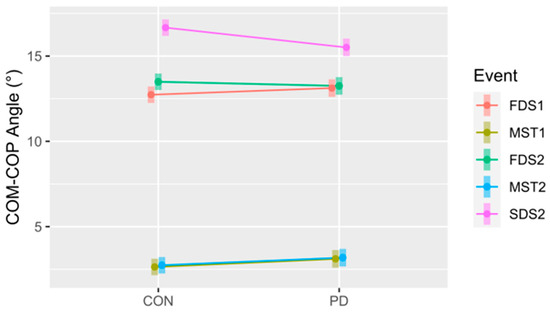 The COM–COP inclination angle for the control (CON) and Parkinson’s (PD) groups at all five Events. FDS1 = first double support step 1; MST1 = midstance step 1; FDS2 = first double support step 2; MST2 = midstance step 2; SDS2 = second double support step 2. Note: FDS2 = second double support step 1. The 95% confidence intervals for each mean are included to illustrate significant differences, i.e., confidence intervals not overlapping, both within and between conditions. Notably, this also suggests differences between Events within each group (CON and PD).