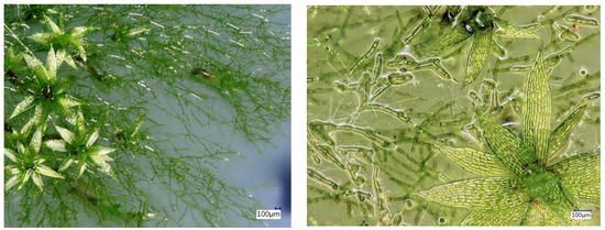 Microscope photographs from the cultivated P. patens before harvesting showing the presence of protonemata and gametophores.
