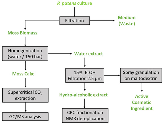 Workflow of the production of the water-based cosmetic ingredient as well as the CO2 P. patens extract used for the composition analysis.
