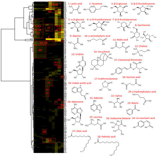 As illustrated in Figure 4, the most polar fraction F10, which represented ≈ 94% of the crude extract mass, was mainly composed of simple sugars (glucose, fructose, and saccharose), as well as amino acids, choline, γ-aminobutyric acid, and malic acid. The less polar fractions F01–F04, representing ≈1.5% of the extracted mass together, were characterized by the presence of the diterpene ceruchinol, as well as fatty acids in the mixture. Lactic acid and succinic acid were significant compounds detected in fractions F05–F09, recovered during the elution step and representing ≈5% of the extracted mass. Other minor compounds of fractions F05–F09 exhibited a high chemical diversity; they included, for instance, coumaroyl-threonate, indole acetic acid, erythronolactone, niacin, leucine or leucine-betaine, tyramine, uridine, and adenosine.