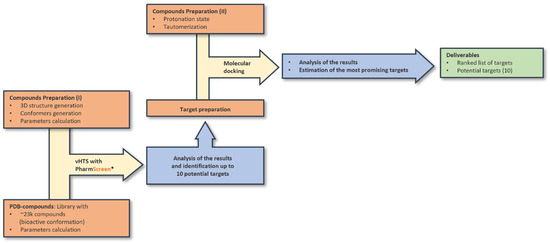 Workflow for the ligand preparation, ligand-based virtual screening, and molecular docking. * Selection of ligands based on chemical structure and available biological information on potential targets.
