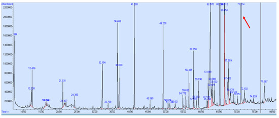 GC-MS profile of the supercritical CO2 extract at 1 mg/mL in EtOH. Total ion current obtained. Ceruchinol was detected at Tr = 71.21 min (red arrow) and corresponds to the major peak. At Supplementary Figure S1 one could see the same graphic but without any zoom in order to reveal the importance of the ceruchinol peak.