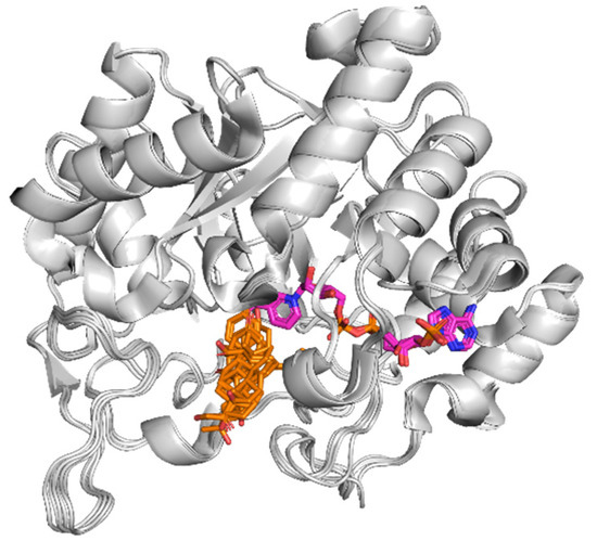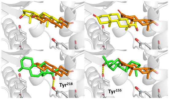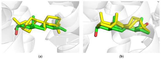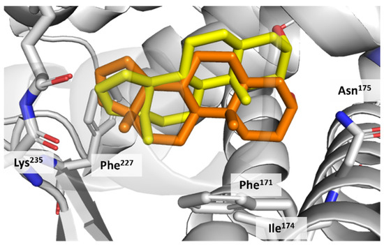 The 1XNX structure comes with a unique ligand called 16,17-androstene-3-ol (ID: ATE), which is similar to ceruchinol (Figure 8). Before running the docking of ceruchinol, we tested the method using ATE as a control in a redocking calculation. The result calculation indicates that the simulated pose of ATE does not coincide exactly with that of the X-ray structure, but the predicted pose is still acceptable since the positional root-mean-square deviation (RMSD) of the re-docked ligand (RMSD = 0.90 Å) is lower than 2 Å, as noted in Figure 9. The slight displacement observed between predicted and X-ray poses is most likely due to the absence of a water molecule bridging the hydroxyl group to the His213 imidazole ring (note that water molecules were eliminated before the docking calculation and hence the docked ligand tends to form a direct interaction with His213). The total energy (Etot) is 2.3 kcal/mol, the interaction energy (EI) is −31.5 kcal/mol, and the docking score (S) is −8.8 kcal/mol.