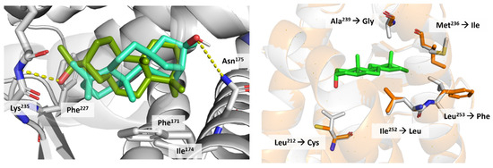 Docking of ceruchinol produced two different poses with slightly different total and interaction energies but very similar docking scores (Table 2). As shown in Figure 9, the ligand is surrounded by non-polar amino acids (e.g., Phe171, Phe227, and Ile174) which stabilise the ligand via hydrophobic interactions. In pose 1, the hydroxyl group is coordinated to Lys235 and is further stabilised via H-bond interaction. In pose 2, the nearest polar residue (Asn175) is 5.0 Å away from the –OH group, but this interaction could be stabilized through a water-mediated interaction, which could be facilitated if one assumes some degree of structural plasticity in the side chains that shape the binding pocket. Considering this, the two poses are retained, and they suggest that the ligand could bind the target protein.