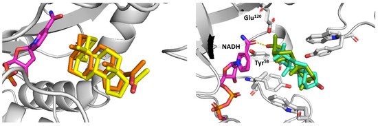 In our in-silico experiments targeted Estradiol 17β-dehydrogenase 1 (17β-HSD1), it appears that ceruchinol, mostly present as a major component of the CO2 extract, has the potential to inhibit the catalyzed conversion of estrogen E1 to the more active E2 (Figure 18). This inhibitory effect is noteworthy, as it suggests a mechanism for controlling local E2 levels by targeting 17β-HSD1 [49,50]. However, our coupling study could not deliver a proper effect on that interaction. Furthermore, ceruchinol is under research for its ability to modulate the activity of AKR1D1. Our coupling study could not deliver a proper effect on that interaction but suggests that ceruchinol would act as a substrate in the catalyzed reaction.