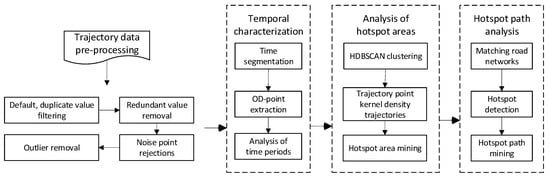 The study outlines a four-stage process for analyzing residents’ travel patterns and hotspots using taxi trajectory data, as depicted in Figure 1. The first stage focuses on data preprocessing, including the removal of default values, duplicates, redundant values, noise, and outliers. The second stage conducts a time feature analysis, segmenting data into larger and smaller time frames to extract origin–destination (OD) points and identify residents’ travel time patterns. The third stage involves density-based cluster analysis (using the HDBSCAN algorithm) and kernel density analysis (employing a Gaussian-function-based method) on selected taxi OD points to determine areas of high travel activity. The final stage delves deeper into these hotspots, performing tasks like road network matching, hotspot detection, and visualization to identify hotspot paths.