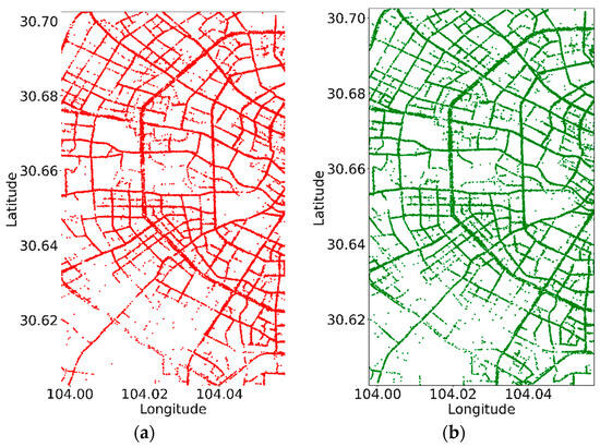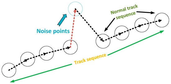 - Elimination of noise points: Noise points, typically arising from taxi collection terminal signal anomalies, equipment failures, or unusual driver behavior, deviate noticeably from the normal trajectory pattern. These points are identified and removed [], as exemplified in Figure 2.