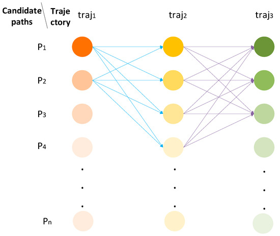 - Calculating transition probabilities: This step involves computing the transition probabilities between taxi trajectory points and multiple candidate paths on the map: