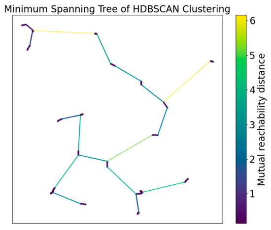 This step involves defining the minimum neighbor density threshold (MinPts) based on core distances. A dense area is formed when the number of neighbors in a cluster exceeds MinPts. The reachability distance is defined as the maximum of the core distance and the actual distance between two endpoints in the MST. If both endpoints are in high-density areas, the actual Euclidean distance is used; if one endpoint is in a low-density area, the larger core distance is chosen. The MST is then transformed into an interconnectivity graph based on this reachability distance.