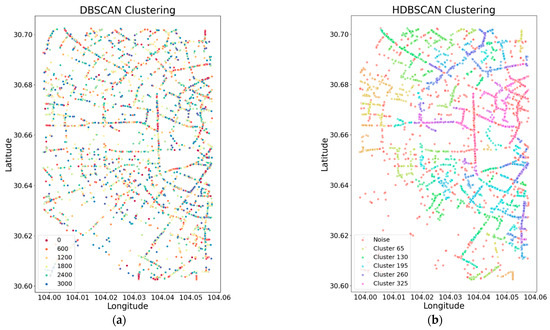 Comparison of different aggregation results: (a) DBSCAN clustering; (b) HDBSCAN clustering.