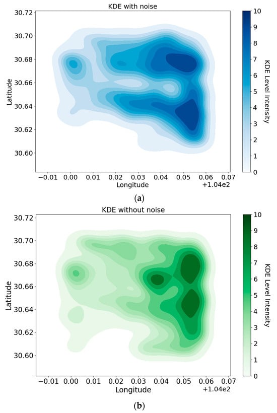 By comparing Figure 9a,b, it becomes evident that after removing the noise points, the kernel density analysis provides a richer and more accurate representation of data point density. This is evident in the varying color depths, which more precisely reflect the density changes in the data points.
