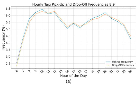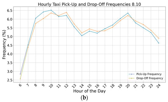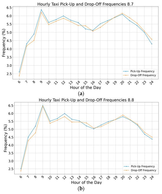 The study started by evaluating the total number of taxi operations on weekdays. Using the processed trajectory data, the total numbers of taxi trips were found to be 6597 and 6846 on the two weekdays, with passenger counts of 56,096 and 58,462, respectively. Next, the analysis focused on hourly travel patterns during weekdays, excluding the 24:00 to 6:00 night period due to low passenger numbers. The analysis included calculating the number of taxi trajectories per day, enabling the determination of passenger pick-up and drop-off trends across different times. These statistics are represented in Figure 10, providing visual insights into the fluctuating demand for taxi services throughout the day.