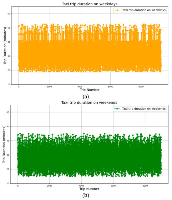 - Mathematical statistical analyses, individual assessments, and comparative examinations of taxi pick-up and drop-off point traffic volumes during distinct time intervals on weekdays and weekends were conducted. The investigation reveals that on weekdays, residents’ travel times range from 19 to 40 min, while on weekends, the average travel time falls within the range of 16 to 35 min. Furthermore, it is observed that the morning and afternoon peak hours for residents’ travel on weekdays occur earlier compared with those on weekends.
