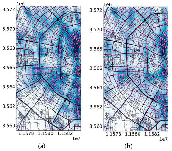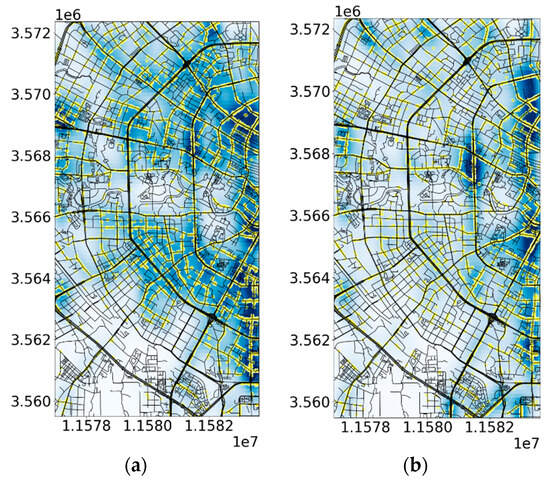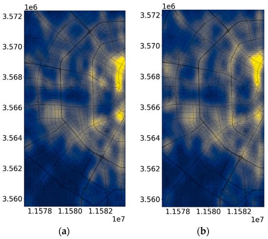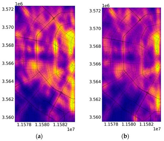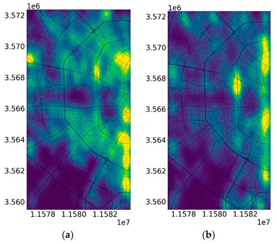 - The heat map for the 11:00–13:00 time period, presented in Figure 14.Figure 14. Heat map of pick-up and drop-off points from 11:00 to 13:00: (a) heat map of pick-up points; (b) heat map of drop-off points.
