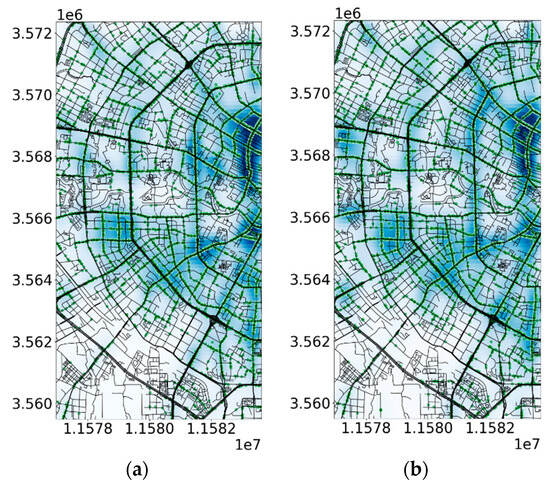 - The heat map for the 7:00–9:00 time period, as shown in Figure 13.Figure 13. Heat map of pick-up and drop-off points from 7:00 to 9:00: (a) heat map of pick-up points; (b) heat map of drop-off points.