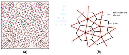 (a) Structure of discrete lattice model with Voronoi cells as particles of material and lattice elements. (b) The proposed enhanced beam element connecting neighboring Voronoi cells. Parameter h is extracted from the Voronoi diagram and represents the height of the beam cross section.