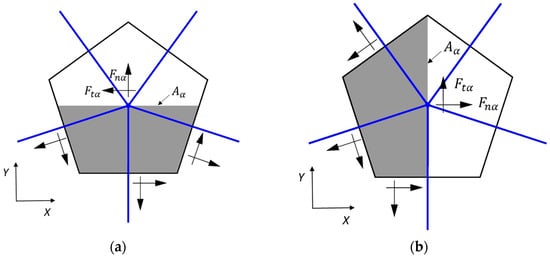 The nodal fictitious force is in equilibrium with the forces acting in the neighboring elements of the Voronoi cell (Figure 6b). Each elemental force is proportional to the projected area of the Voronoi cell on the cut plane . After the elemental forces are computed, they are projected into the local coordinate system of the elements and added to the corresponding lattice elements.