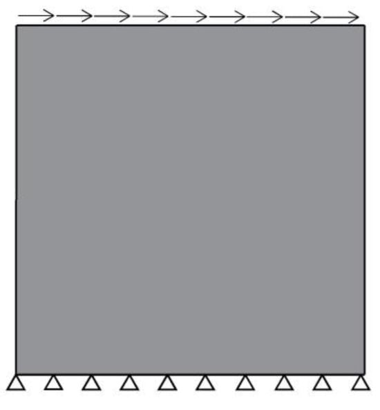 In the shear-dominated test, a load inducing shear stresses is applied to a rectangular domain, as depicted in Figure 8. More precisely, horizontal displacement is imposed on the top of the specimen. This test is performed using the proposed discrete lattice model with a Poisson ratio set to zero. To capture the stresses in this test, the methodology outlined in Section 2.2.1 is followed. The proposed model is designed to accurately represent the response of a linear elastic continuum when the Poisson ratio is zero, similar to the rigid-body spring model presented in [8]. The mechanical and geometrical characteristics of the test are detailed in Table 1. The discrete lattice model consists of 4842 lattice elements. Figure 9a illustrates the computed nodal stress component, specifically focusing on shear stress. The computed nodal stress obtained using the discrete lattice model is then compared to the results from a standard FEAP solid-element model (Figure 9b) with identical characteristics. The stress values obtained from these two cases align, showing the accuracy and reliability of the proposed discrete lattice model in capturing the shear-dominated response.
