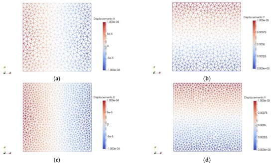 Displacement of Voronoi nodes for tension test for imposed displacement 0.001 cm for = 0.2: (a) displacement in direction x-Mesh1; (b) displacement in direction y-Mesh1; (c) displacement in direction x-Mesh2; (d) displacement in direction y-Mesh2.