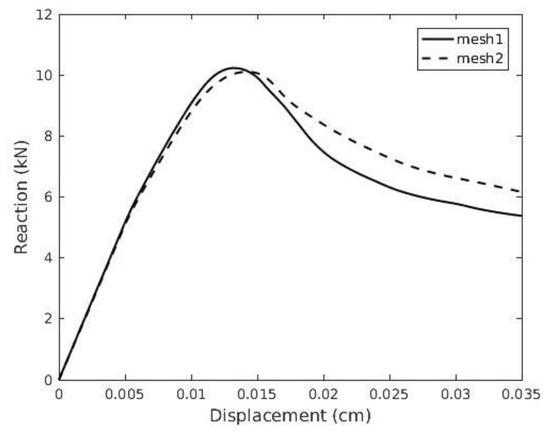 However, the initiation of the first fractures causes the specimen to transition into a discontinuous state until total failure. The macroscopic responses in terms of the reaction–displacement curve in Figure 16 illustrate the material softening during the failure process. Slight differences in the amount of total dissipated energy and softening are observed between the two meshes due to a slightly varied failure mechanism arising from internal heterogeneity and the randomness of the lattice network.