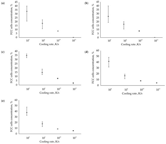 Concentration of FCC cells in solid argon phases formed by isobaric cooling from the liquid phase at speeds of 108–1011 K/s and at pressure values of 0.5 MPa (a), 1 MPa (b), 2 MPa (c), 3 MPa (d), 4 MPa (e).