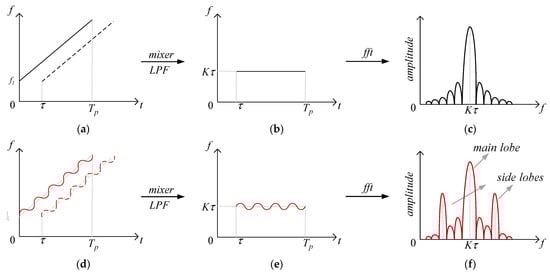 where is the spectrum of the ideal beat signal. Under the influence of periodic nonlinearity in frequency modulation, the beat signal generation process is shown in the second line of Figure 2. In Figure 2d, the solid and dashed red lines represent the frequencies of the transmitted and received signals over time, respectively. After mixing and low-pass filtering, periodic changes in the frequency of beat signal occur, as shown in Figure 2e. Figure 2f is the spectrum based on Equation (9). Periodic nonlinearity is presented in its spectrum in the form of side lobes.