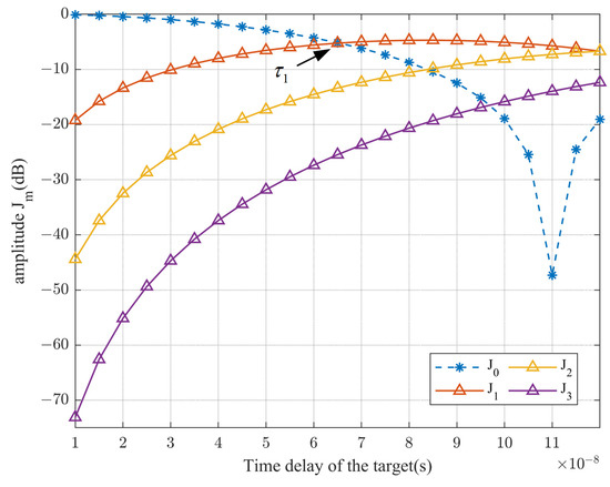 The above derivation of the impact of periodic nonlinearity does not rely on approximations, making it suitable for short and long distances, unlike any previous studies [11]. More deeply, the amplitude of the spectrum is determined by the magnitude of the Bessel function from Equation (9). When , the value of the Bessel function represents the amplitude of the main lobe. In other cases, the value of the Bessel function represents the amplitude of the side lobe. As a matter of fact, the periodic nonlinearity in the system is not too large. We take based on the previous work [16]. Therefore, the amplitude of the main lobe and each side lobe can be obtained at different target time delays. , , , and represent the amplitude of the main lobe, the first side lobe, the second side lobe, and the third side lobe, corresponding to , respectively. Their variation with respect to target delay is shown in Figure 3. Since is larger than and , is used as the representative of side lobes for analysis. and intersect at . The system can only work properly if the main lobe is larger than the side lobes, i.e., the left part of the intersection where . In this region, the main lobe decreases as increases, while increases as increases. In other words, ratio is smaller with the target being farther.