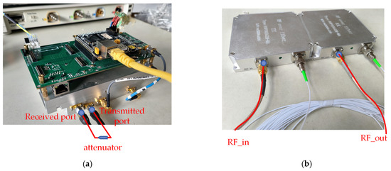 From the above, the major difference between periodic nonlinearity and phase-locked loop spuriousness is the clutter generated by them has different trends with the target delay. To investigate this tendency of the clutter used in the system and exclude environmental interference, a series of closed-loop experiments were carried out. In particular, the transmitted and received ports of the system were directly linked using different lengths of connecting wires to simulate target echoes. The physical picture of the closed-loop experimental used is shown in Figure 5a.