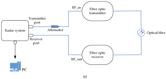 Optical fiber has the characteristics of long transmission distance, high anti-interference ability, and very low signal attenuation. Therefore, the optional fiber was selected as the connecting line for the closed-loop experiment. Figure 5b is the physical picture of the fiber optic module whose model number is R0F006GEM-MA (It first appeared at Corning, NY, USA). Port RF_in is the RF input port for connecting to the transmitted port, and port RF_out is the RF output port for connecting to the received port of the radar system. The specific connection between the radar system and the fiber optic module is shown in Figure 5c. The length of the accessed optical fiber was varied to simulate changes in the target time delay.