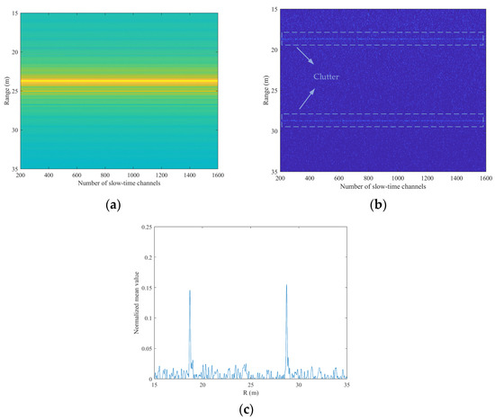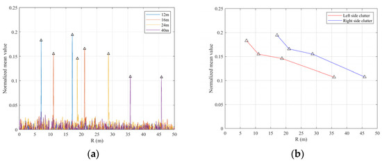 To observe the characteristics of the clutter more clearly, the above-processed data were accumulated along the slow time direction. The cumulative result is shown in Figure 6c. The positions of the two spikes in it are located at 18.69 m and 28.73 m. Both are exactly symmetric, about 24 m. This indicates that the positions of the clutter on both sides of the main lobe are symmetrical about the peak position of the main lobe. The clutter is defined as left clutter and right clutter based on its front-to-back position with the main lobe.