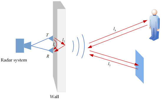 Since the clutter is the side lobe of the echo signal, its energy is much weaker than that of the main lobe. In through-wall detection, the energy of the human target’s echo signal is very small, in which means that its side lobes can be neglected. In this case, the main causes of clutter are the directly coupled wave from the transceiver antenna, the reflected echo from the wall and the reflected wave from a strongly reflected stationary target. The energy of these three waves is strong, so their side lobes, i.e., the clutter on their sides, are pronounced. As shown in Figure 8, represents the transmitting antenna and represents the receiving antenna. They are all placed against the outer wall. Paths , , and correspond to different echoes: the direct coupling of the transceiver antenna, reflection from the inner wall, reflection from a strong stationary target, and reflection from a human target, respectively.