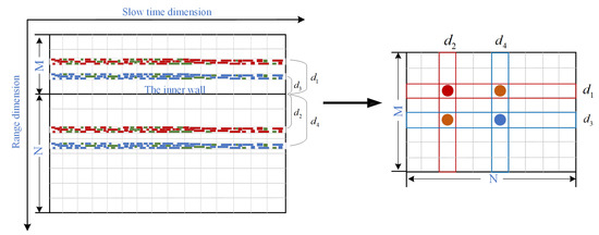 The range corresponding to the maximum value of the echo spectrum needs to be found. This range serves as the dividing line for the range-slow time matrix. In through-wall detection, the most powerful echo is the reflection from the inner wall, which is path in Figure 8. Therefore, the range corresponding to the maximum value is the position of the inner wall. The matrix of range-slow time echoes is divided into upper and lower parts bounded by it. As shown in Figure 9, the upper matrix contains M rows and the lower matrix contains N rows. Rows and columns represent the range dimension and the slow-time dimension. The two matrices are denoted as and , respectively. Row of matrix and row of matrix can be expressed as