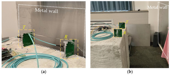 The experimental scenario in free space. (a) The front view of the experimental scenario; (b) The side view of the experimental scenario.