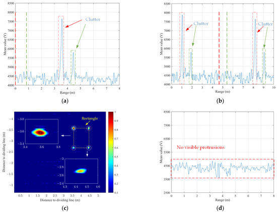 Additionally, the radar is moved backward in steps of 0.3 m away from the metal wall. As the metal wall becomes farther away from the radar, the position of the main lobe of its echo moves backward and the amplitude becomes weaker. The clutter waves located on either side of it are similarly shifted backward and become weaker. When the distance between antennas and the metal wall is far enough, the clutter is drowned in background noise. Therefore, the range of distances at which the presence of clutter generates false alarms can be measured by varying the distance between antennas and the metal wall. When the radar moves back to a spacing of from the metal wall, the clutter on both sides of the main lobe of the metal wall echo is so weak that it is submerged in the background noise. At this point, the green axis in Figure 11b moves to the position of . Therefore, is the maximum range at which clutter from a strongly reflected target like a metal wall cannot be ignored. At this limit, the position of the green clutter is on the left if . This means that the farthest position of the left clutter generated by the strongly reflected target still remains to the left of the red axis. Therefore, the left half of the clutter is located to the left of the dividing line and the right half is located to the right of the dividing line. It ensures that the correlation of a pair of symmetric clutter can be calculated. This verifies the correctness of the proposed method to divide the matrix with the boundary of this position.