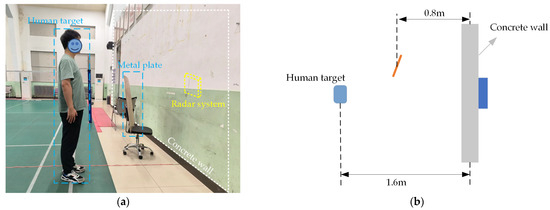 The experimental scenario of through-wall detection. (a) The photo of the experimental scenario; (b) The top view of the experimental scenario.