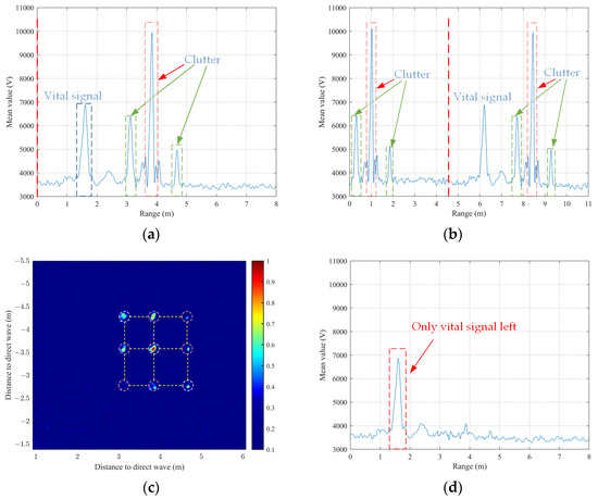 The beat signal is processed according to the steps in Section 3. Only time-varying clutter is left. After accumulating along the slow time, the clutter is highlighted, as shown in Figure 11a. The red dashed axis in Figure 11a is the position of the main lobe of the directly coupled wave from the transceiver antenna, and the green dashed axis is the position of the main lobe of the wave reflected from the metal wall. They are eliminated in the treatment of highlighting the clutter. The locations of the two axes are denoted as , . Only two spikes are observed in Figure 11a, which are clutter waves located to the right of the main lobe. The clutter symmetrical to it does not appear. The positions corresponding to the two peaks are denoted as , , respectively.